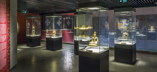 展廳盡量采用人工光源;門窗柜面玻璃盡量選用阻輻射性能好的特種玻璃;文物展品的照明避免過強,針對性選用濾紫外線的燈具或LED、光導纖維之類的新型節(jié)能照明器具。