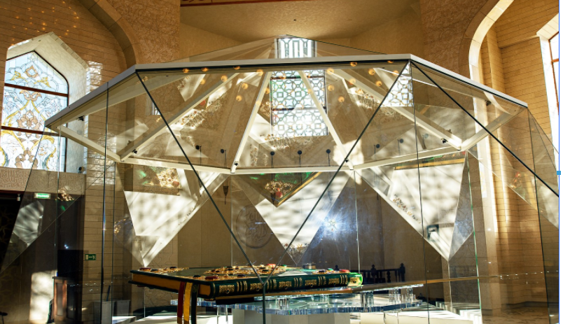 克里克設(shè)計(jì)并制作了一個(gè)獨(dú)特的水晶帳篷形狀的展示柜。該陳列柜于2018年3月安裝,以八字形狀的底座為基礎(chǔ)。底座被涂成白色,這是伊斯蘭文化中最受人喜愛的顏色,以展現(xiàn)一種純正和寧?kù)o的感覺。頂部的金屬梁也是如此。展示墻安裝沒有支柱。整個(gè)建筑僅由玻璃墻支撐,充分展示了我們的精確設(shè)計(jì)和精湛的施工技巧。陳列柜主要由玻璃制成,整體形象類似于一個(gè)巨大的水晶帳篷,與博物館的頭盔狀圓頂完美呼應(yīng)。
