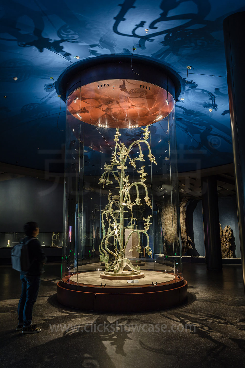 通高260.8CM的青銅大立人,身體中空,分人像和底座兩部分,為了更好的襯托銅人的巨大,我們使用全景玻璃圓弧展柜將該展柜上部的空間做得更高,高4M的展柜無形中拉大了銅人的整體效果,電動側滑的打開方式讓古老的藝術與現(xiàn)代技術無形中交融,“通天”大立人名不虛傳。