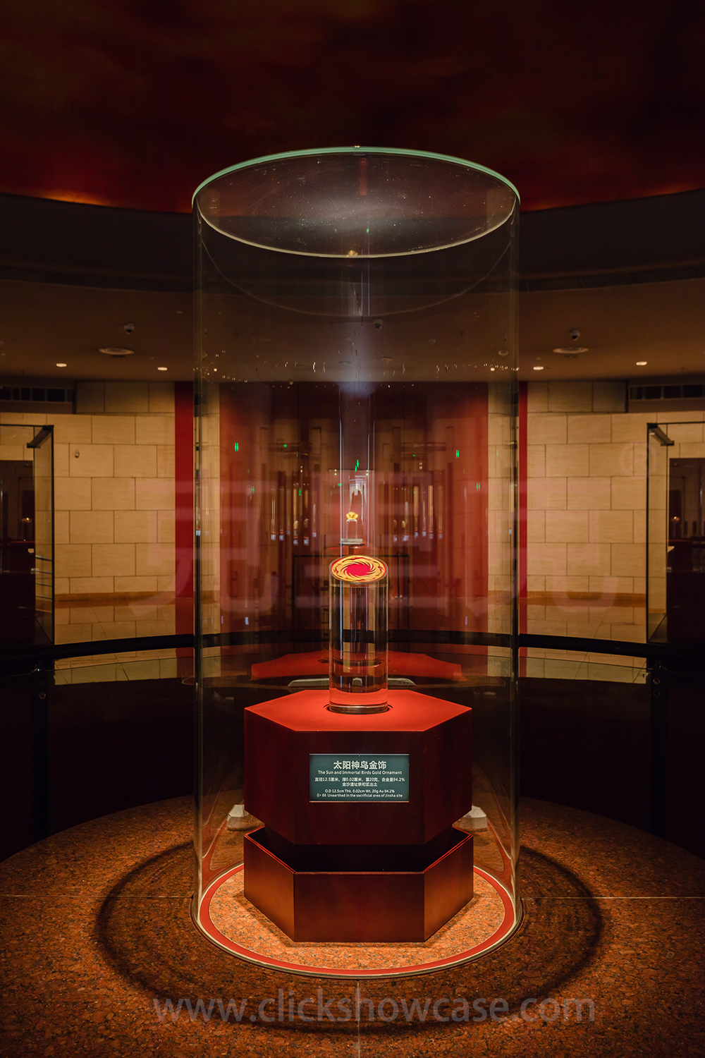 成都金沙遺址博物館太陽神鳥金飾圓弧獨立展柜實拍效果圖