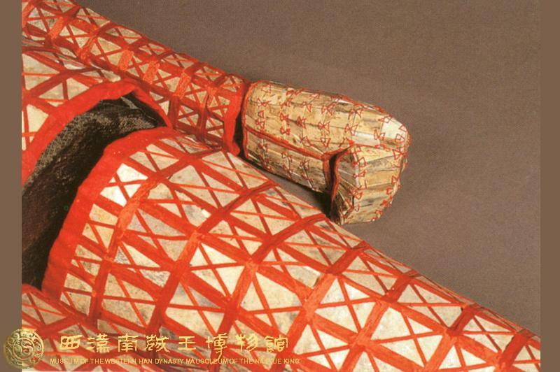 南越王的絲縷玉衣,長1.73米,共用了2291片玉,用絲線穿系和麻布粘貼編綴做成。分為:頭套、上身衣、袖套、手套、褲筒和鞋六部分。