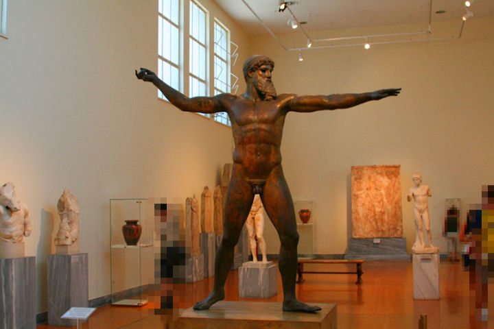 該照片攝于希臘國家考古藝術(shù)博物館,我們看到所有的陶瓶都被放置與展柜空間中,所有的青銅、大理石材質(zhì)的雕像都放在開放空間中,沒有設(shè)置展柜。